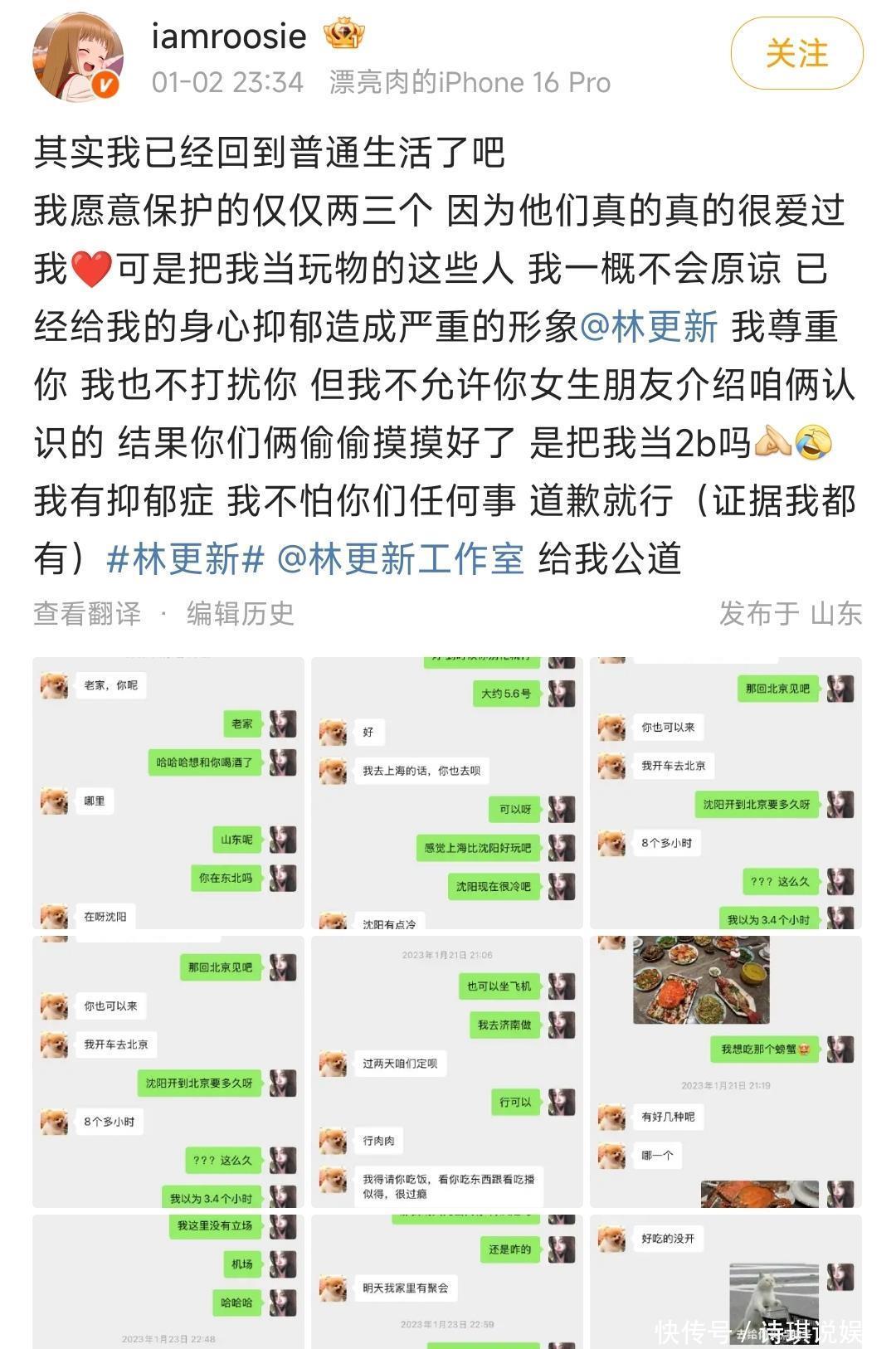 她还说 林更新邀她去东北,自己被伤害到抑郁,可聊天记录看着就是普通朋友对话,范丞丞、黄明昊也被强行点名,甚至扯出关晓彤和 王安宇的绯闻。