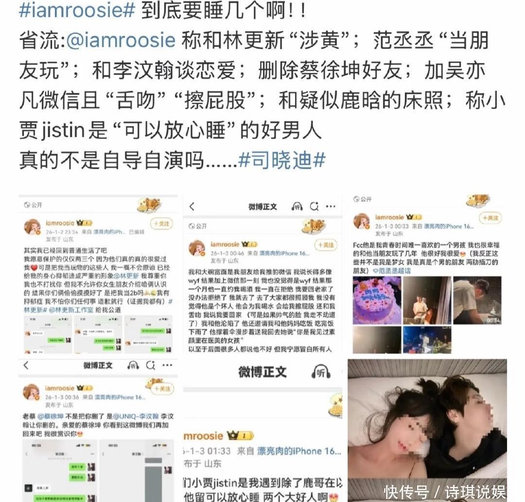 2026𻂉񀙒日深夜𳗣日 凌晨,网红司晓迪在社交平台连爆猛料,她点名鹿晗、林 更新、檀健次等十多位男星,称和他们有私密关系,还晒出一张床照和几段聊天记录。